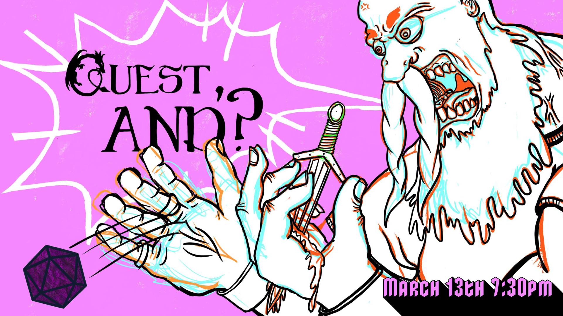 Roll for laughs with Quest, And?! as we bring you Dungeons & Dragons inspired improv as its wildest! We'll create an epic (and probably ridiculous) quest on the spot filled with questionable heroes, absurd villains, and plot twists no one saw coming, not even us!