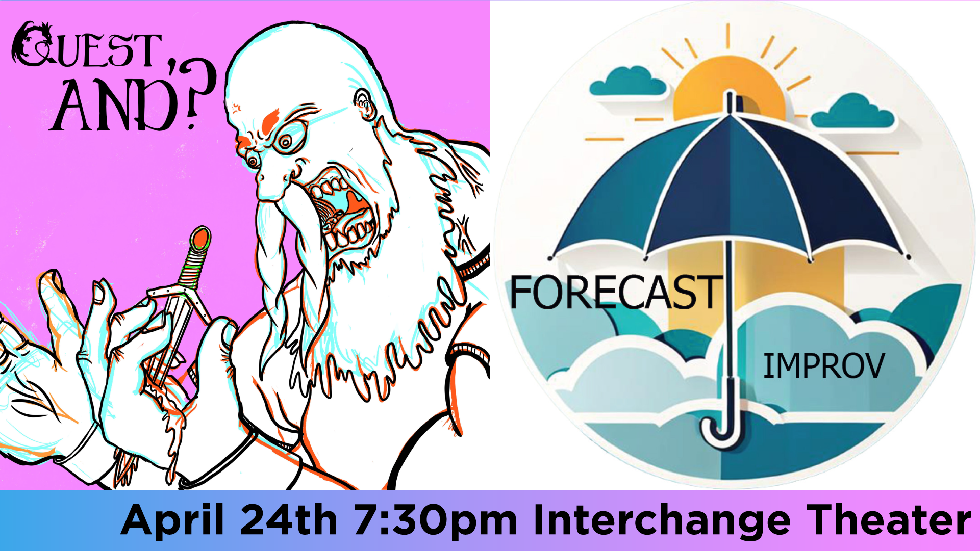 Roll for laughs with Quest, And?! as we bring you Dungeons & Dragons inspired improv as its wildest! We'll create an epic (and probably ridiculous) quest on the spot filled with questionable heroes, absurd villains, and plot twists no one saw coming, not even us!