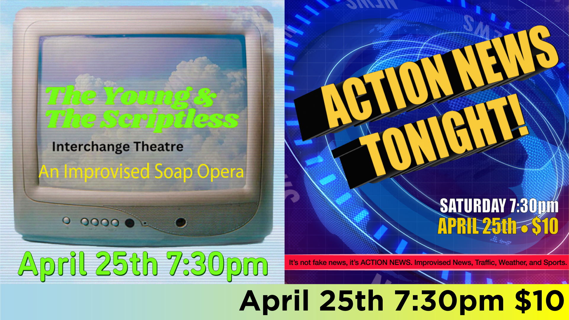 Fake News ain't got nothing on us, because this is ALL made up! Brought to you by the best IMPROVISED NEWS TEAM in Milwaukee! We've got the coverage you can count on across crime, entertainment, traffic, sports, weather, and even the "feel-good" news! Catch the broadcast based on your suggestions, and see the comedic stories unfold! We might even syndicate it for localized viewers across the globe!
