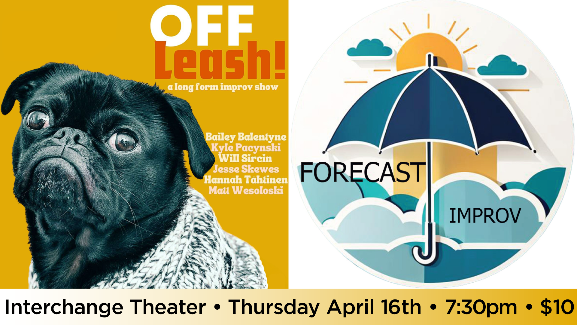 Unpredictable, just like the weather. Enjoy a flurry of scenes that set up the atmospheric conditions for a perfect storm of improv. It will be raining goofs and laughs as Andrew, Betsy, Jesse, and Rachel take the stage to perform duo-prov in random pairings.